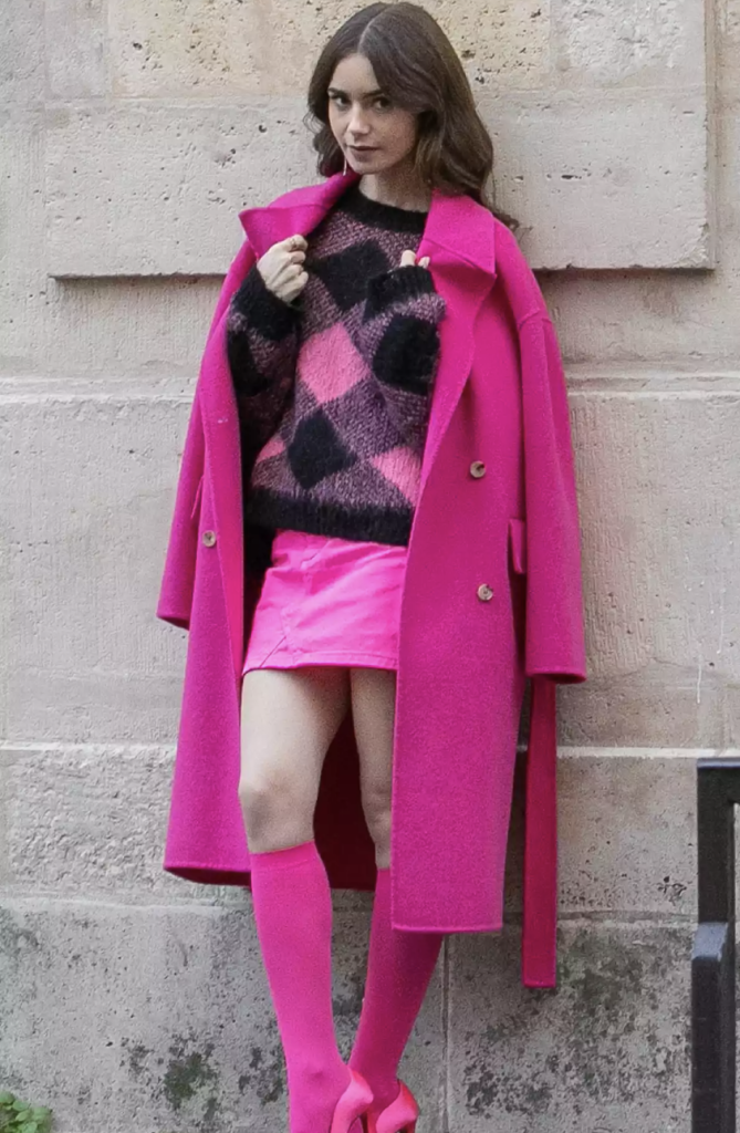 In the first season, we saw a hot pink Kenzo coat in several iterations, from put-together work looks to running casual errands on the weekend. Though this look debuted in 2020 with the show’s launch, the vibrant pink quickly became a trendy color in fashion and remains so to this day.