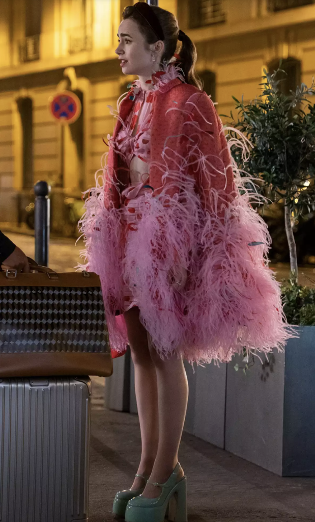 Here’s Emily channeling her inner bird of paradise as she has an emotional run-in with Alfie. She rocks a whimsical pink-and-red feather cape paired with a chic patterned cutout dress in the same color scheme and, finally, shiny mint-green platform heels that help break up the look.