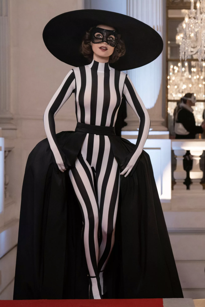 While it’s not Emily’s most accessible look, the black-and-white striped onesie paired with a lace mask is giving Venetian vibes, and the removable half ballgown makes it even more of a statement piece, making her the belle of the masquerade ball.