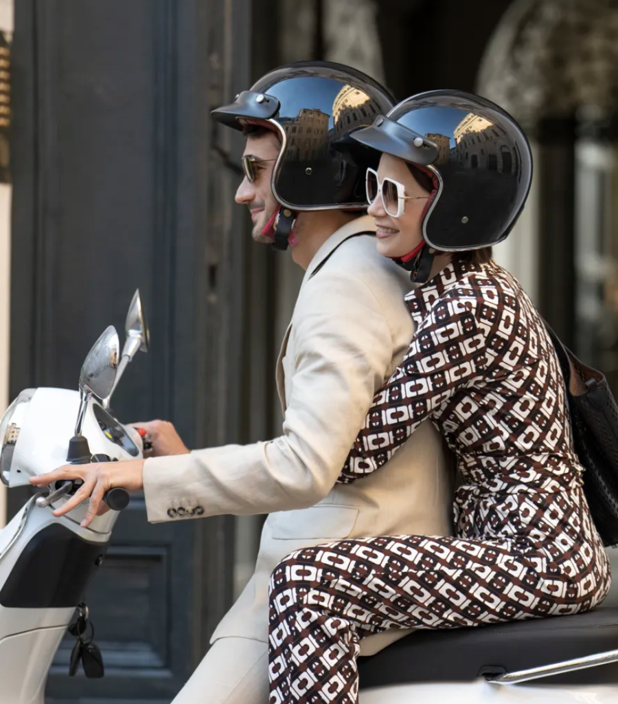 In Season 5, we see Emily in more Italian-inspired looks given the change in landscape—one of them is this 70s-inspired geometric jumpsuit by DVF that she wears and looks fabulous in on the back of a Vespa with her Italian lover.