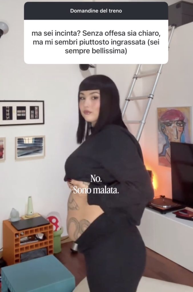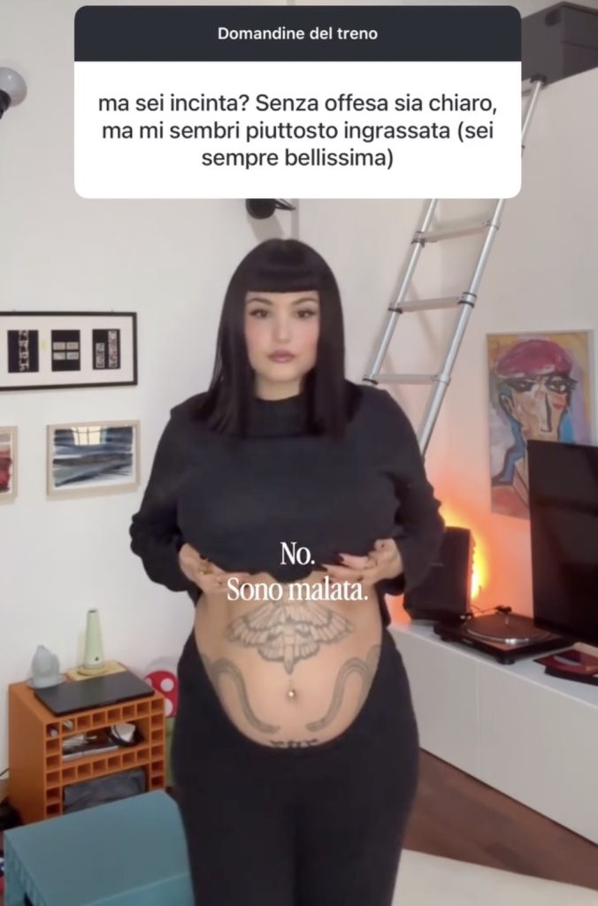La trentenne influencer, modella e scrittrice, nota anche per la partecipazione a Pechino Express e per la sua precedente relazione con Damiano David, ha condiviso un video in cui solleva la maglietta e mostra il gonfiore addominale. Il tutto per rispondere a un utente che le aveva chiesto se fosse incinta, giustificando la domanda con un presunto aumento di peso. Un commento che, pur formulato con apparente gentilezza, ha toccato un tema delicatissimo per chi convive con una malattia cronica.