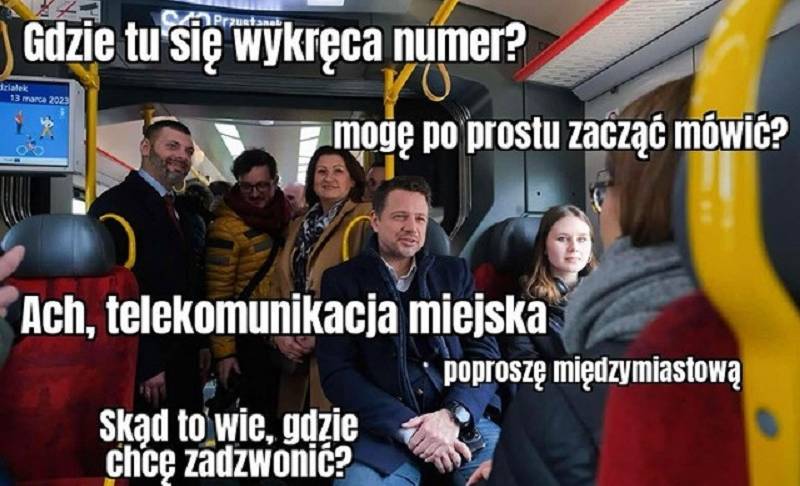 • „Jazda telekomunikacją”: Fotografia przedstawiająca Trzaskowskiego jadącego metrem odnosząca się do jego pomyłki językowej.