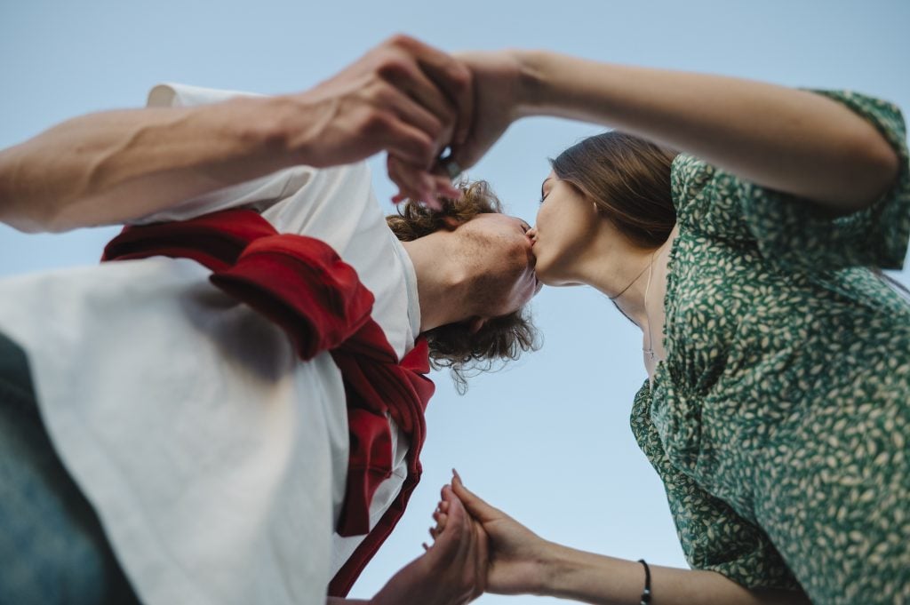 Not every kiss needs to scream “bedroom now.” Sometimes you just want a moment of tenderness and silliness. Butterfly kisses with your eyelashes, Eskimo kisses with your noses—these aren’t exactly hot stuff, but they will make you feel close and comfortable and a little silly. Is that not part of real intimacy too?