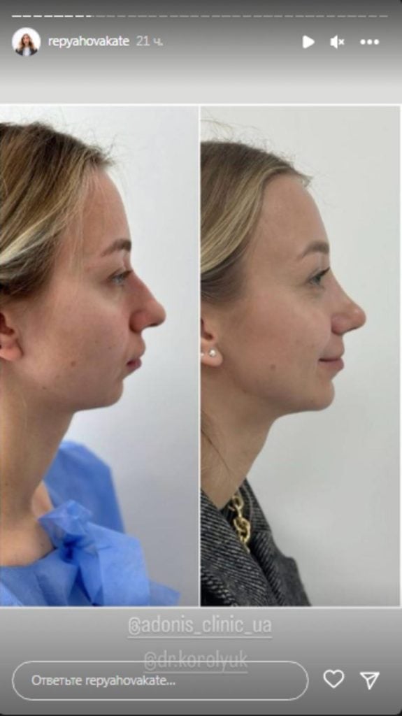 «Я запитувала себе: як можна було так спотворити гарне підборіддя? Навіщо?» — писала блогерка в Instagram. Вона не приховує: якби могла повернути час, не робила б нічого. Тепер Катя чесно застерігає своїх підписниць: будь-яка операція — це ризик, і гарантій, що нова зовнішність сподобається — немає.