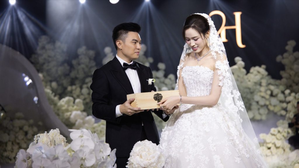 Cặp đôi đã cùng thực hiện một nghi lễ khá độc đáo có tên gọi “Nghi thức cất rượu vang vào hộp tình yêu” (Wine Box Ceremony) để bày tỏ cam kết về một tình yêu gắn bó chặt chẽ, bền vững và thăng hoa theo thời gian, giống như vị ngon của rượu vang, càng để lâu càng có giá trị. Theo đó, họ đã cùng nhau cất chai rượu vang vào chiếc hộp tình yêu có tên cô dâu và chú rể.